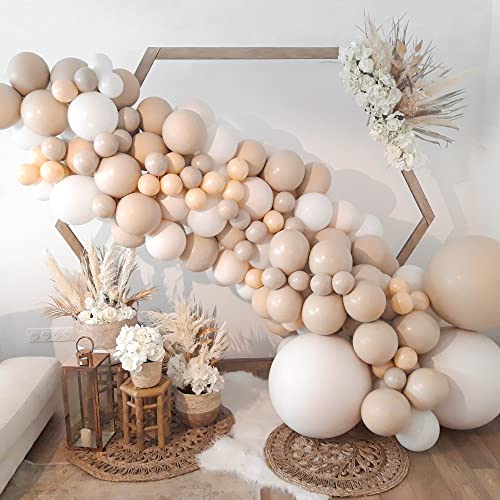Geef je droombruiloft een boho- of champéstijl met deze houten boog met een elegante draperier, onze kleurrijke ballonnen of onze micro led-lichtsnoeren.